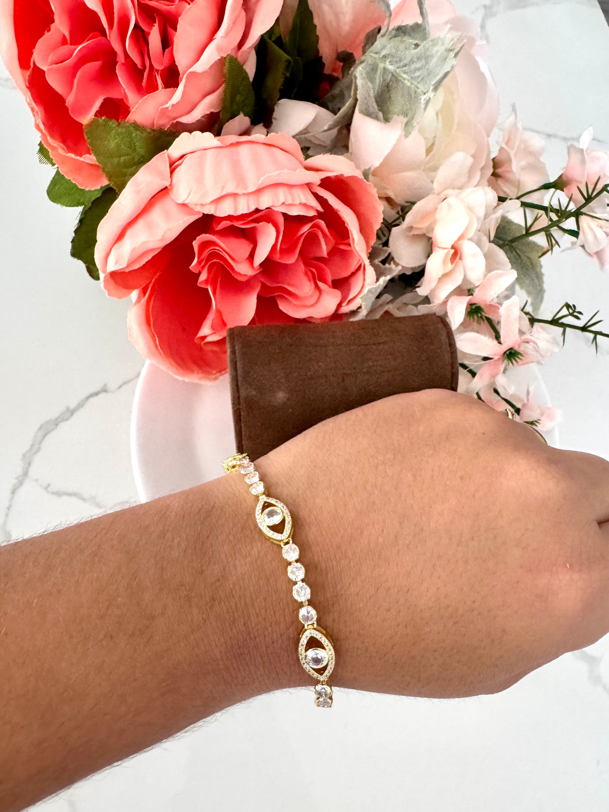 Pulsera ajustable con dije ovalado de ojo turco y circonias – Bañada en oro de 18K