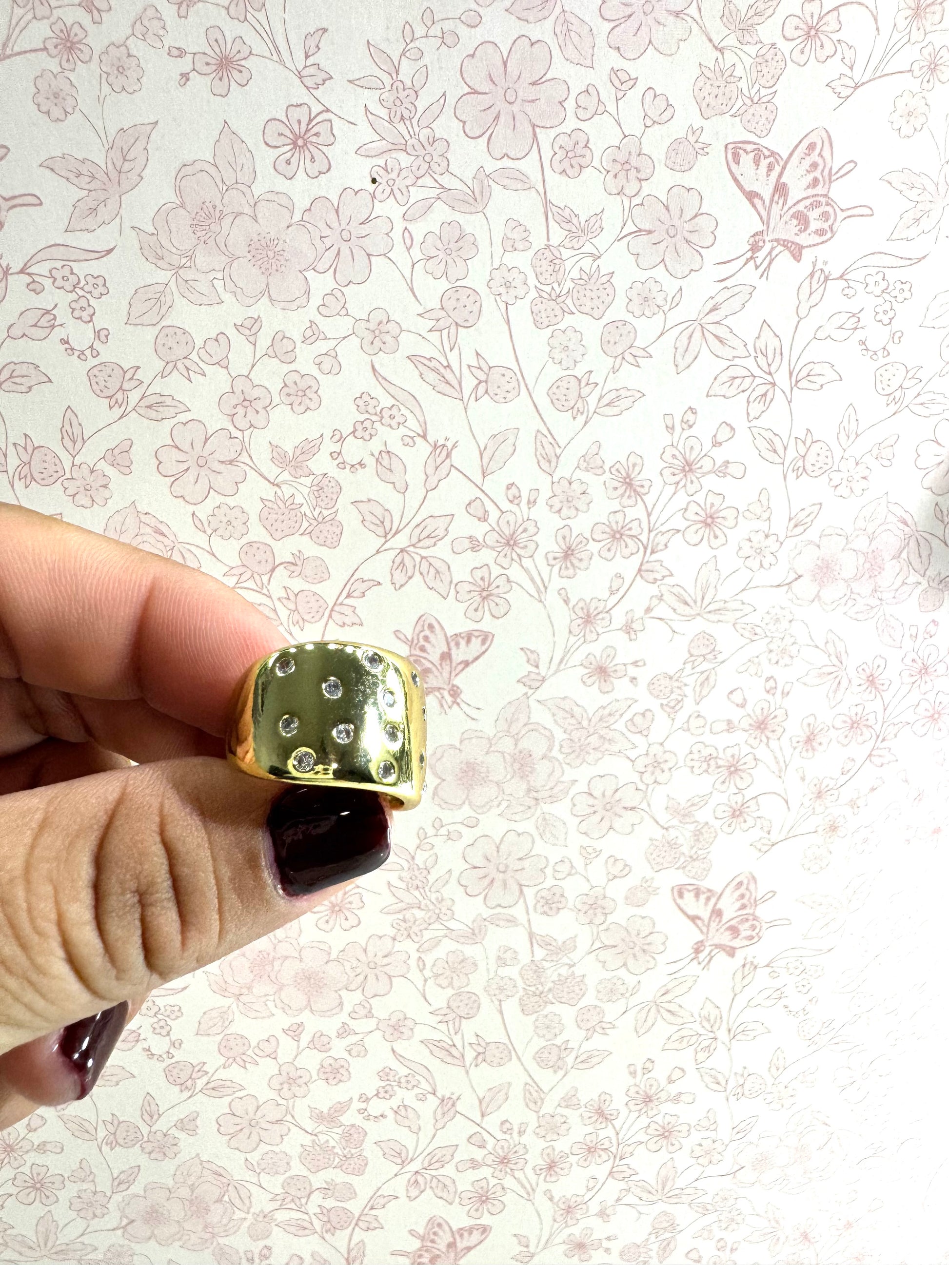 Diseño ancho con pequeños destellos incrustados, ajustable que lo hacen resaltar con estilo. Un anillo elegante y versátil para brillar en cualquier ocasión.