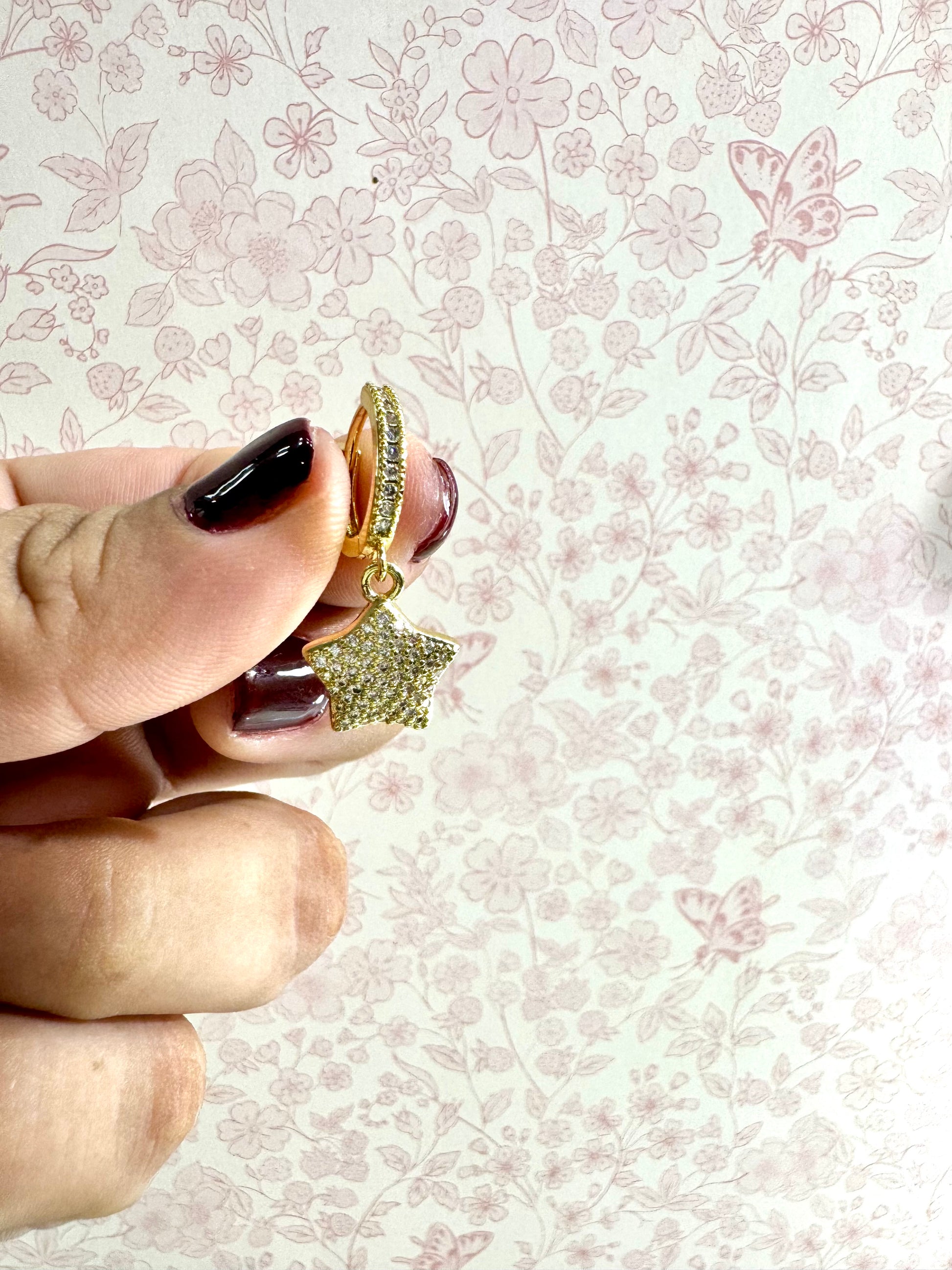 Aros dorados con incrustaciones de brillo y dije de estrella colgante. Un diseño moderno y encantador que ilumina cualquier look.