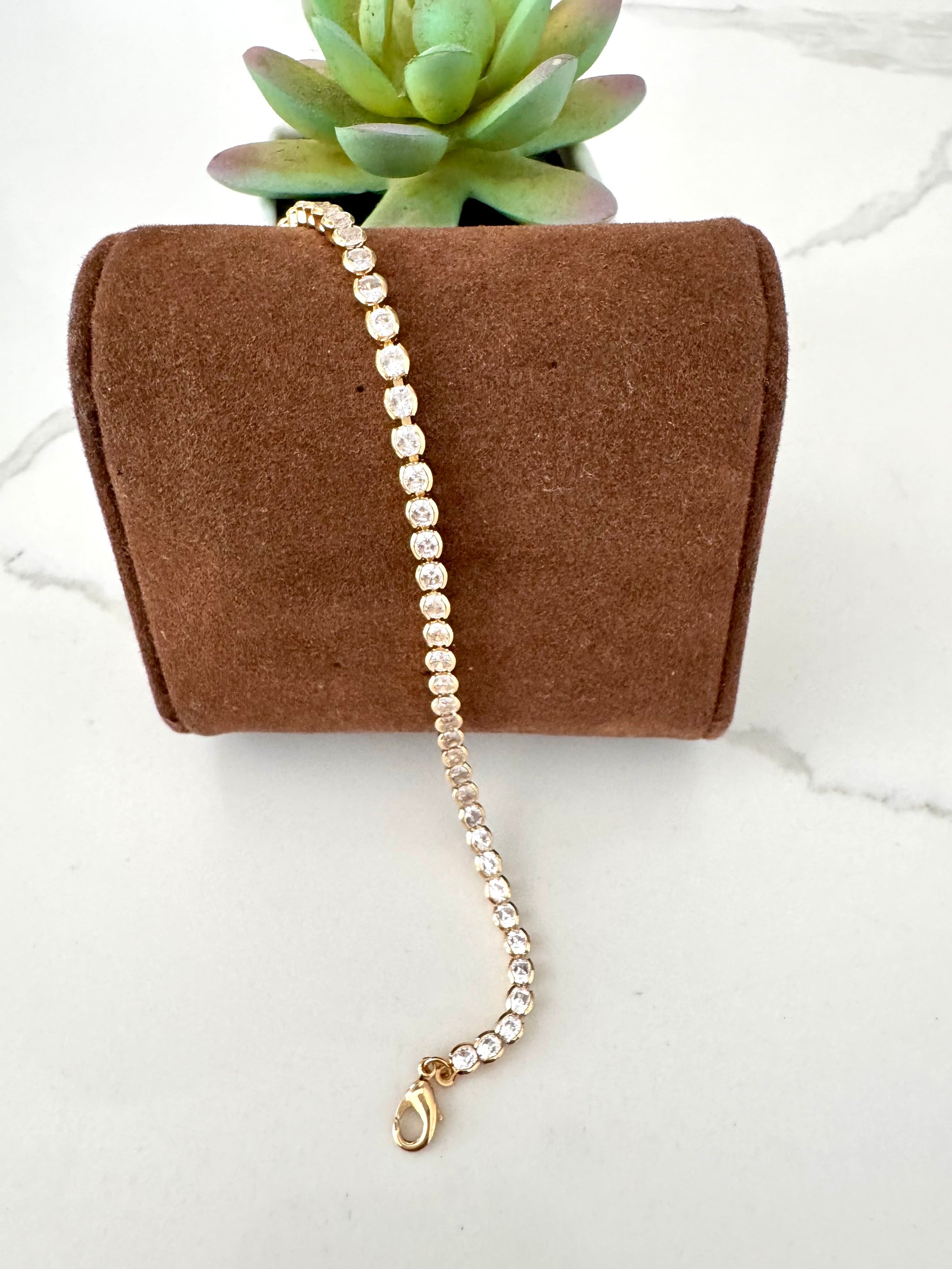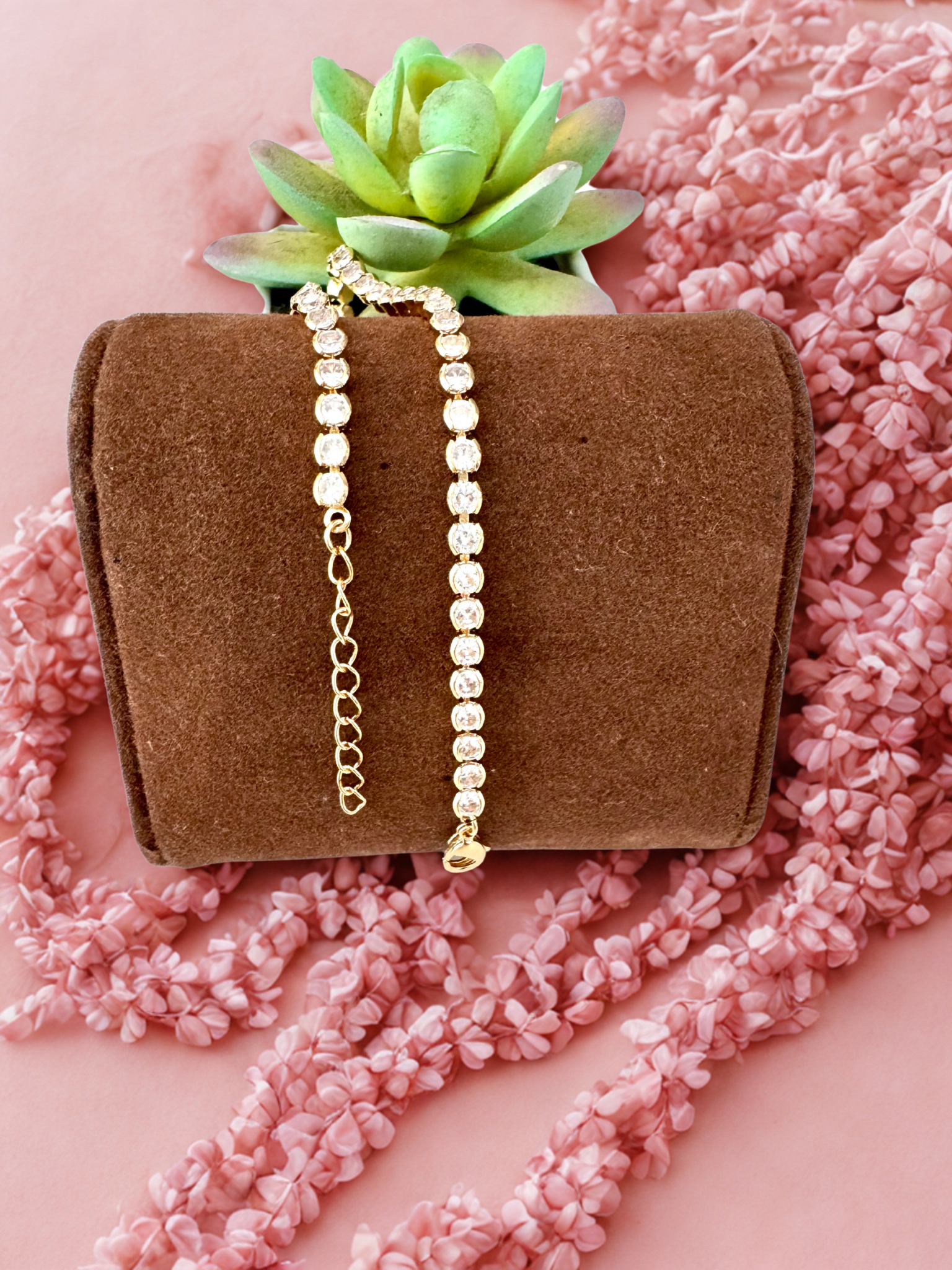 Un clásico que nunca pasa de moda. Esta pulsera tipo tennis está elaborada con circonias cúbicas transparentes engastadas en un diseño fino y brillante, perfecto para dar un toque de elegancia a cualquier ocasión. Disponible en acabado dorado, es ideal para usar sola o combinada con otras pulseras para un look más sofisticado.