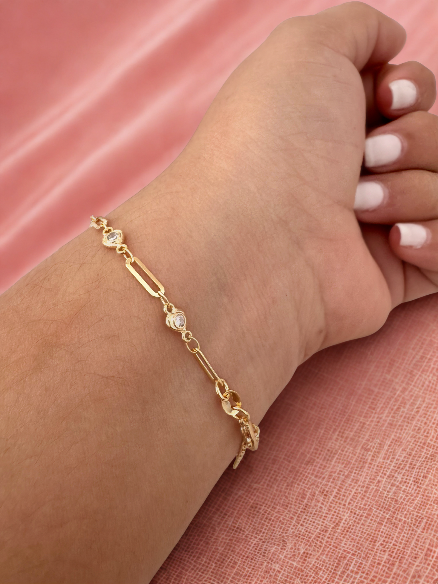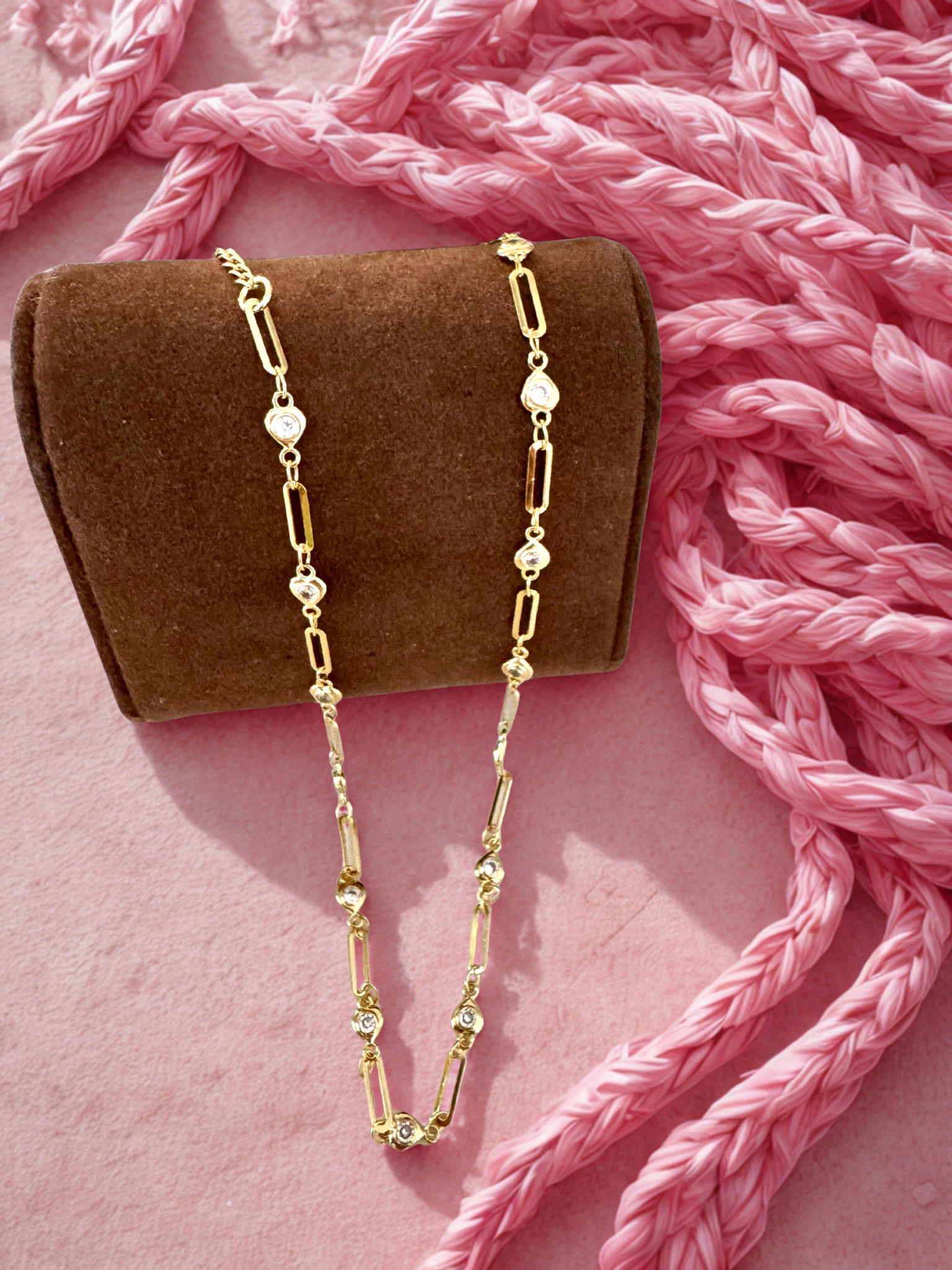 Un set versátil y sofisticado que combina un delicado collar y una pulsera a juego. Cada pieza presenta una cadena de eslabones alargados intercalados con circonias cúbicas engastadas, logrando el equilibrio perfecto entre brillo y elegancia.