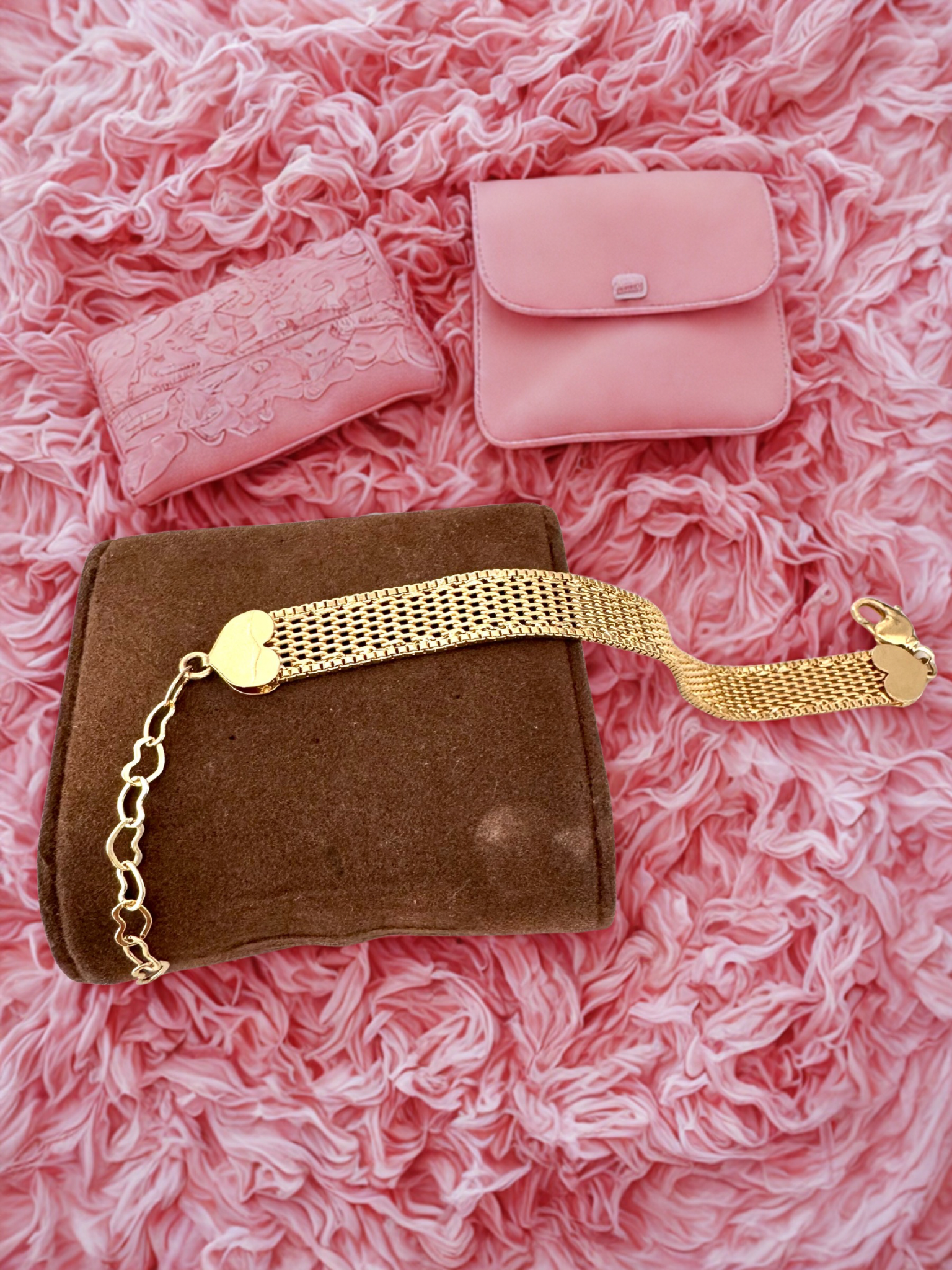 Una joya que combina textura y elegancia. Esta pulsera tipo malla destaca por su diseño sofisticado y versátil, perfecta para llevar sola o en capas con otras piezas. Elaborada con baño de oro de 18K, ofrece un acabado brillante y duradero, ideal para realzar cualquier look.
