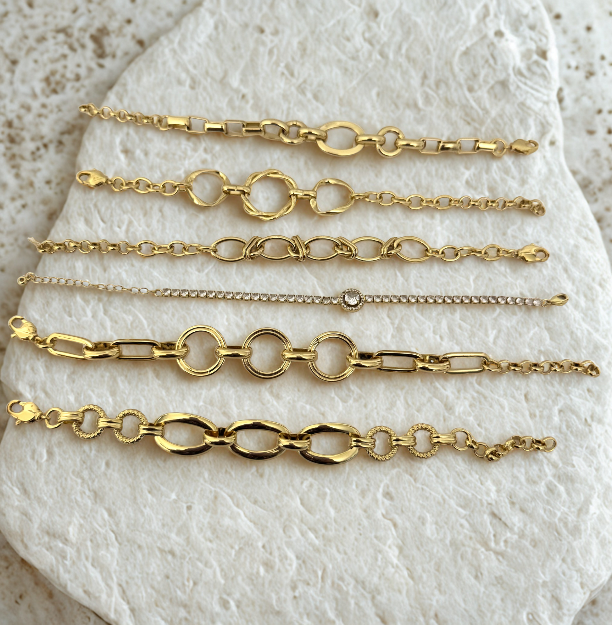 Pulsera de rodio con eslabones dorados que mezcla texturas lisas y martilladas. Un diseño sofisticado y versátil que realza cualquier look. ✨