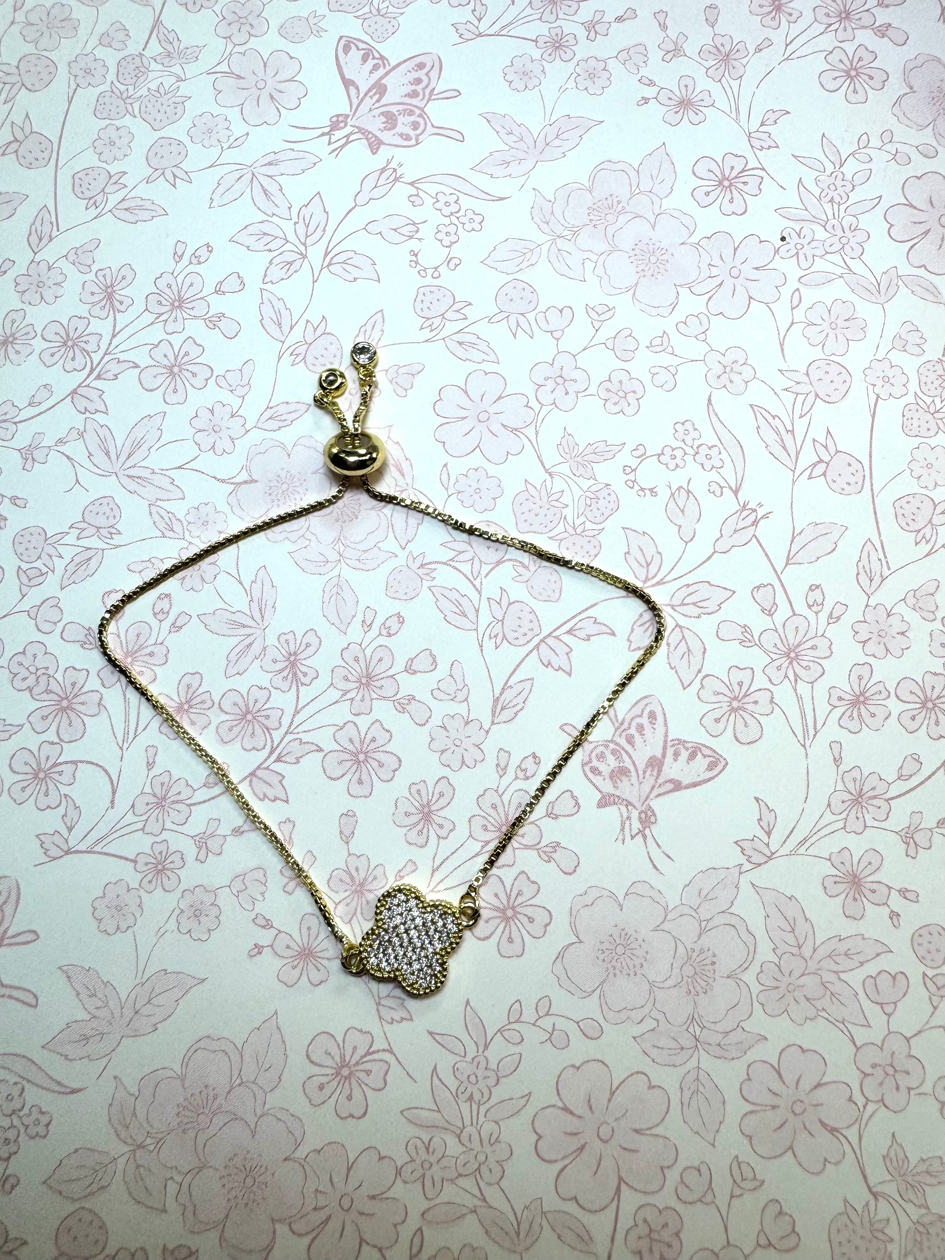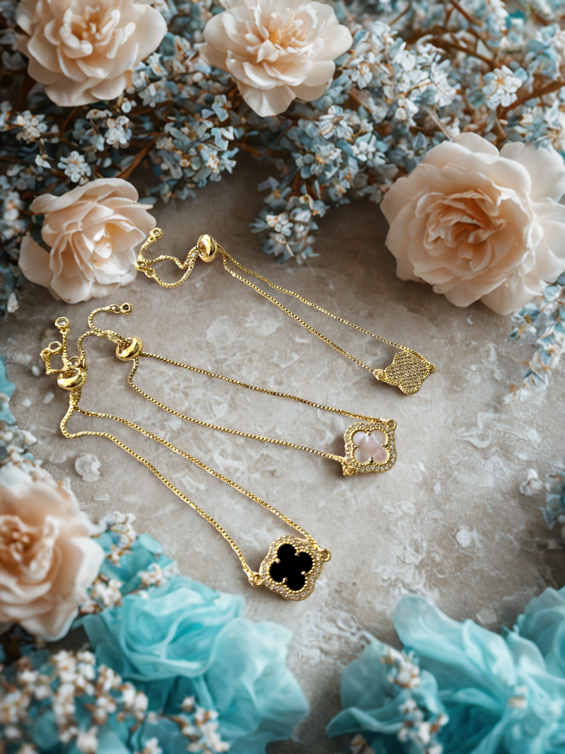 Pulsera ajustable con dije de trébol en acabado dorado. Un accesorio delicado y elegante, disponible en tres estilos únicos para combinar con tu look o regalar con un significado especial. ✨