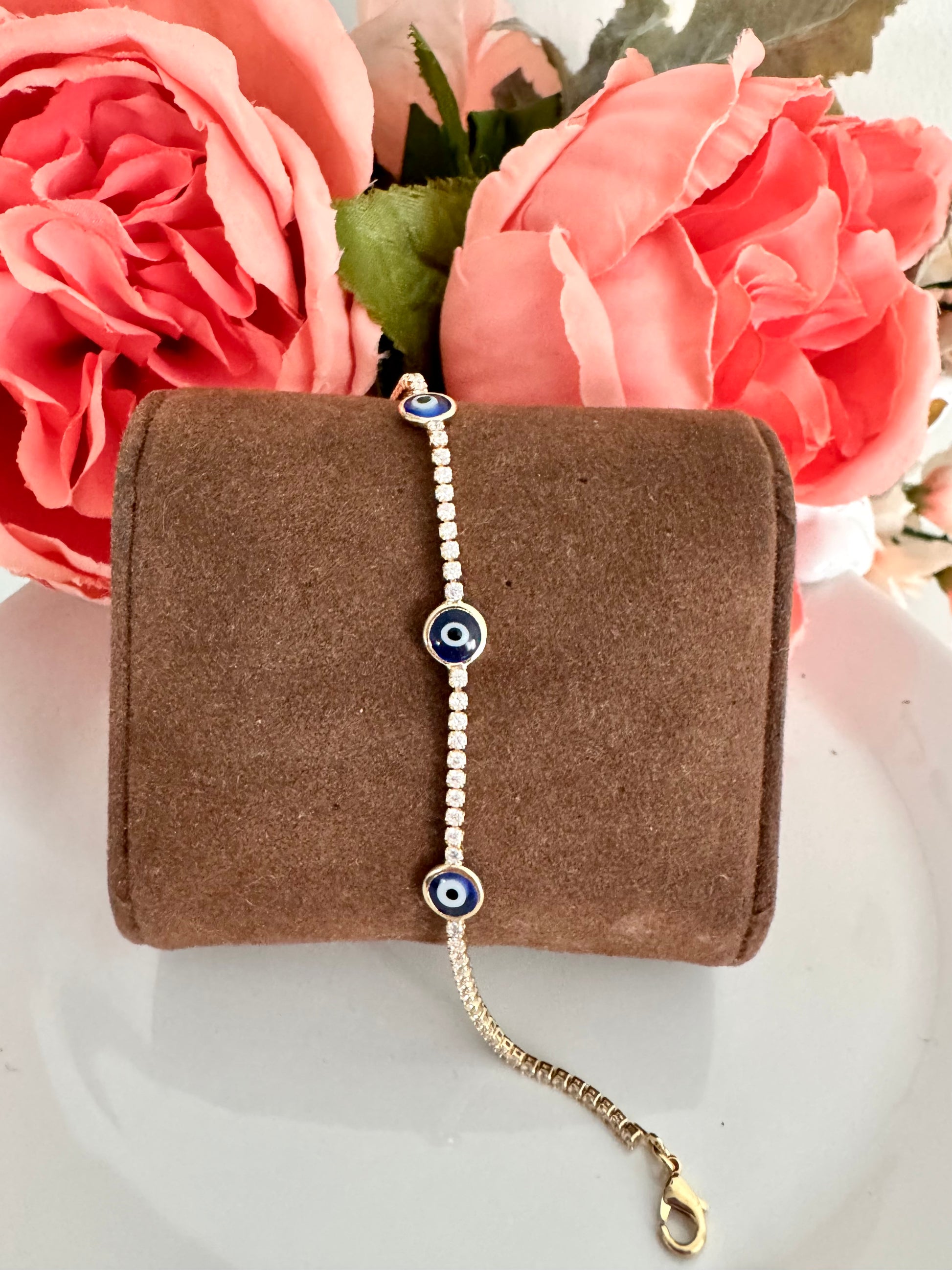 Luce elegante y protegida con este set exclusivo compuesto por collar y pulsera a juego. Cada pieza está adornada con dijes de ojo turco esmaltado en azul, símbolo de protección contra las energías negativas, y una delicada cadena tennis con circonias cúbicas que aportan un brillo sofisticado.